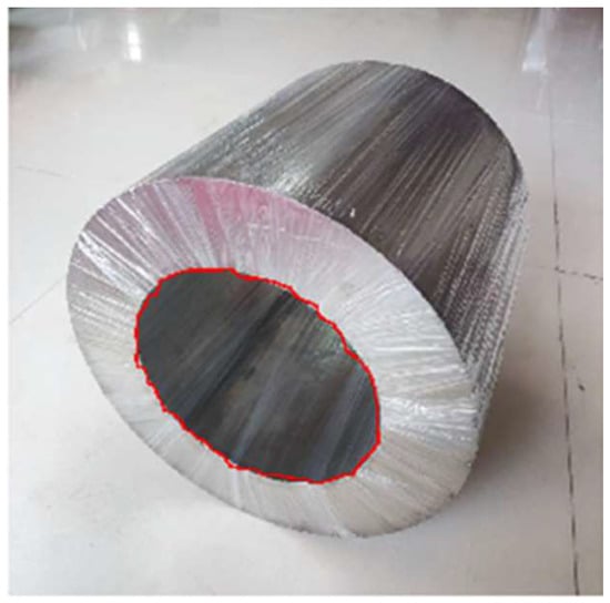 To reduce the computational load and complexity of subsequent image processing while enhancing the portability and reusability of target region extraction for steel coils, this paper employs a deep-learning approach. Specifically, it utilizes the Mask R-CNN feature extraction algorithm within the deep-learning framework to identify and extract the target region of steel coil corner guards, thereby obtaining a mask color image of the mounting holes. The image segmented by the Mask R-CNN architecture was further refined using the RGB vector space image segmentation method to produce a binarized image of the steel roll eyes. Figure 8 illustrates sample images of steel coils with varying packaging processes, qualities, and sizes.