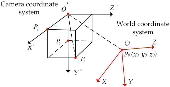 From the linear camera imaging model [], we derive the relationship between coordinate points (Xw, Yw, Zw) win the world coordinate system and their projection points (u, v) in the image pixel coordinate system, as shown in Equation (10).