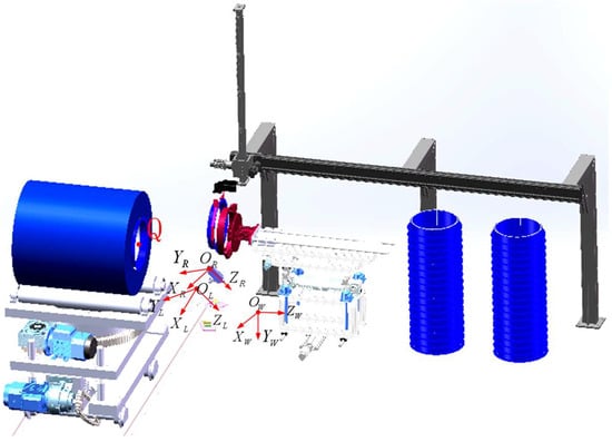 To obtain the three-dimensional coordinates of Q of the end face of the steel coil in the world coordinate system, a world coordinate system Ow − XwYwZw with the same orientation as depicted in Section 2 is established, with left camera coordinate system OL − XLYLZL and right camera coordinate system OR − XRYRZR, as shown in Figure 19.