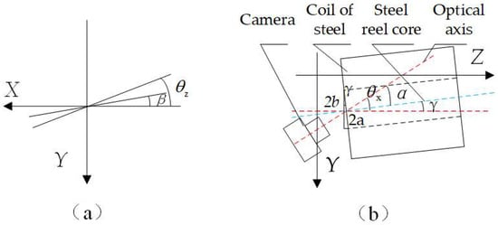 Based on the relative positions of the camera coordinate system and the world coordinate system, it is evident that the end face of the steel roll is inclined at an angle to the lens, resulting in the circular mounting hole being imaged as an ellipse within the camera’s field of view. Based on the relative positions of the camera coordinate system and the world coordinate system, it is evident that the end face of the steel roll is inclined at an angle to the lens, resulting in the circular mounting hole being imaged as an ellipse within the camera’s field of view. As illustrated in Figure 20a, when the end face of the steel coil and the end face of the corner guard are parallel, the angle between the long axis of the ellipse and the horizontal axis is denoted as (θz), as derived from the camera’s external reference matrix. Conversely, when the end faces of the steel coil and the corner guard are not parallel, the angle between the long axis of the ellipse and the horizontal axis is represented by (β), with the counterclockwise direction being defined as the positive direction. The camera captures the image and, following image segmentation, yields an elliptical image. Based on the principles of elliptical projection, the length of the long axis corresponds to the pixel length of the roll eye’s diameter, while the length of the short axis represents the projection of the roll eye’s radius in the vertical direction relative to the camera’s shooting direction []. As depicted in Figure 20b, the angle between the camera’s optical axis and the center axis of the steel coil is denoted as (α), the angle between the center of the steel coil and the Z-axis is represented by (γ), and the angle between the camera’s optical axis and the Z-axis is (θx). These angles can be derived based on the mathematical relationships illustrated in Figure 20: