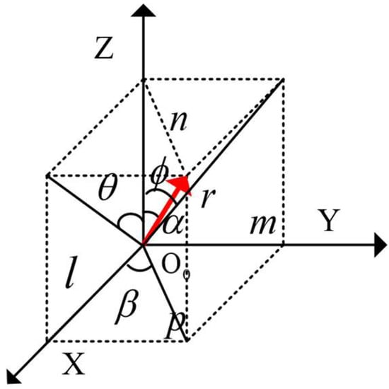As illustrated in Figure 21, to establish the positional coordinate system, the direction of each coordinate axis was aligned with that of the preceding world coordinate system. The arrow in the figure denotes the direction of the steel coil’s axis, with the angle between this axis and the Z-axis being (α). The angle of inclination of the ellipse’s long axis is (β), and the pitch angle (θ) and the deflection angle (φ) are as indicated in the figure. Let the length of the axis be (r), with its projections on the x, y, and z axes being (l), (m), and (n), respectively. The relationship between the pitch angle (θ) and the deflection angle (φ) with respect to (α) and (β) is as follows: