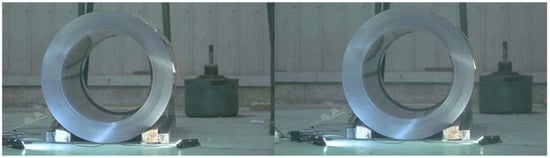 The final visual detection error was analyzed by employing the calibration method and detection process detailed in the preceding section. These techniques were applied to conduct roll eye positional attitude detection experiments on steel rolls that have been assigned specific positional attitudes at the coil packaging site, thereby obtaining the magnitude of the detection errors. The sample images captured by the left and right cameras are illustrated in Figure 23.