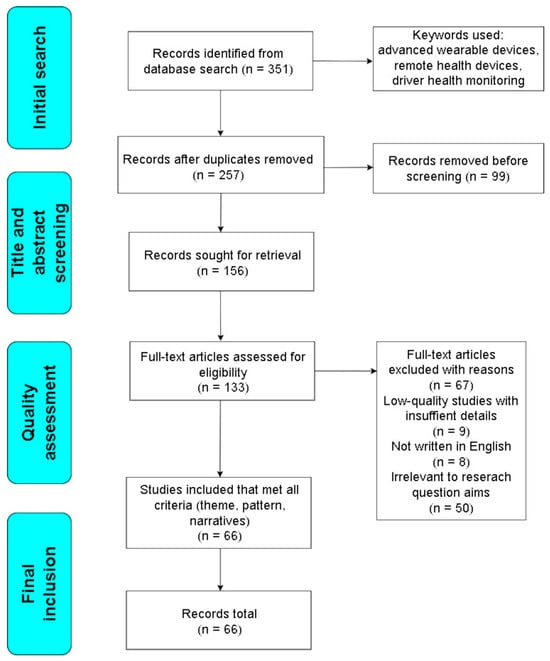 This study identified 351 articles after searching using the search keywords. Of this amount, 99 articles were filtered out by the duplication criteria using the Mendeley software application (Version 2.131.0). After the duplication procedure, 94 papers were removed since their research scope did not adhere to the criteria of the aim of our review. At the quality assessment stage, 67 records were removed, so the review finally comprised 66 records after applying the inclusion and exclusion criteria for eligibility.