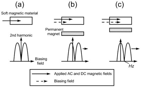 Operational principle of the magnetic field sensor. The harmonic field possesses a symmetrical nature and is dependent upon the presence of an applied direct current (DC) field (a). The positioning of a permanent magnet generates a biasing field, which results in a shift in the harmonic field pattern (b). As the separation distance between two magnetic elements decreases, the secondary biasing field experienced by a soft magnetic material increases accordingly. (c) Copyright MDPI (2008) [26].