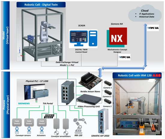 As mentioned, the basic design concept of the hardware architecture integrates three major subsystems, which operate, communicate, and synchronize together: PLC, SCADA, and DT 3D-virtualization of the complete process using Siemens NX MCD [], using PROFINET and OPC UA interfaces, acting as a complete flexible manufacturing cell with DT functionality that performs synchronized tasks for operations and functionality of the engineering process.