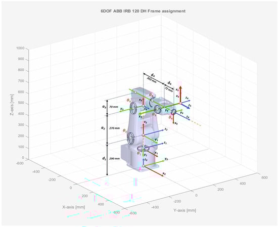 D-H link coordinate system and frame assignment for the ABB 120 IRM.