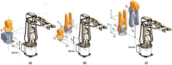 ABB 120 IRM frame transformations according to D-H convention: (a) frame Σ0 to frame Σ1; (b) frame Σ1 to frame Σ2; (c) frame Σ2 to frame Σ3.
