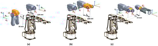 The D-H parameters from Table 2, defined by the manipulator kinematic parameters, are substituted into the homogeneous transformation matrices, sometimes called relative transforms, for generating the joint-to-joint transformation matrices for each frame and link dimension [], which maps the coordinates of adjacent links over the link i. The initial frame, , is moved to achieve the next frame , origin , and rotated with about the x-axis. The translation distance along the z-axis is , as pointed in Figure 3a.