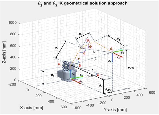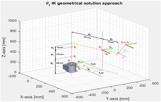 To simplify the problem, the kinematic decoupling method is implemented by splitting the inverse kinematics general problem into two separate directions using the relative position and orientation of the intersection of the three reference systems in one point: first homogenous matrix defines the position and second matrix for solving the orientation problem of the spherical wrist. The geometric solution for the first joint angle is determined by reducing the three-dimensional problem into an XY-plane, taking into consideration only the first three joints and keeping in mind that the wrist motion of the fourth coordinate system is not influencing the equation. The first angle, , is calculated by computing the position of the wrist, , from the rotation matrix, , by using the approach vector, , and position vector, , of the end effector position (Figure 5). The geometric solution for the inverse kinematics of the first link angle, , admits two possible solutions, although it is not always physically or mechanically possible. and are calculated as below: