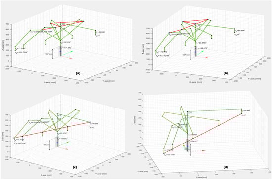 For the singular configuration , meaning in the matrix is 1, it generates an infinite number of solutions (degenerate solution, in this case, cannot be determined), only the sum of can be found; thus, it is common to arbitrarily set to null and solve the joint angle.
