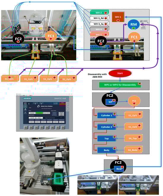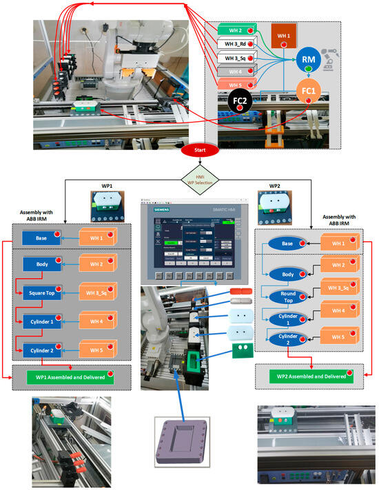 A/DRC assisted by ABB 120 IRM performs assembly and disassembly operations of a predefined 5-component product for two workpieces called WP1 and WP2, [,,]. The assembly flow process starts from storing and supplying subcomponents and progresses to the final delivery of the fully assembled, designated product type onto the cell conveyor unit, which functions as a transport line. The workpiece to be assembled consists of five components: a base pallet, a body, a top, and two inserted cylinders, which may be either plastic or metal. To introduce flexibility in manufacturing, two workpieces can be handled in the robotic cell depending on the operator’s selection. The top part is different, it can be either with square edges (WP1) or with a rounded shape (WP2). The assembly process involves RM performing repetitive tasks of picking, handling, and transporting the subcomponents to the specified assembly area within the cell, task planning for the assembly process of WP1 or WP2, is shown in Figure 8. First, the base pallet is placed on the conveyor FC2, then the product is partially assembled on a suspended bracket called Assembly Tray FC1. The body, top, and cylinders are fitted in this location, then the structure is placed on the base pallet. Once the assembly is complete, the assembled workpiece is transported via the conveyor FC2 to the right side of the cell, the delivery point for assembled products, serving as a starting point for another manufacturing process.