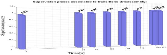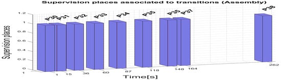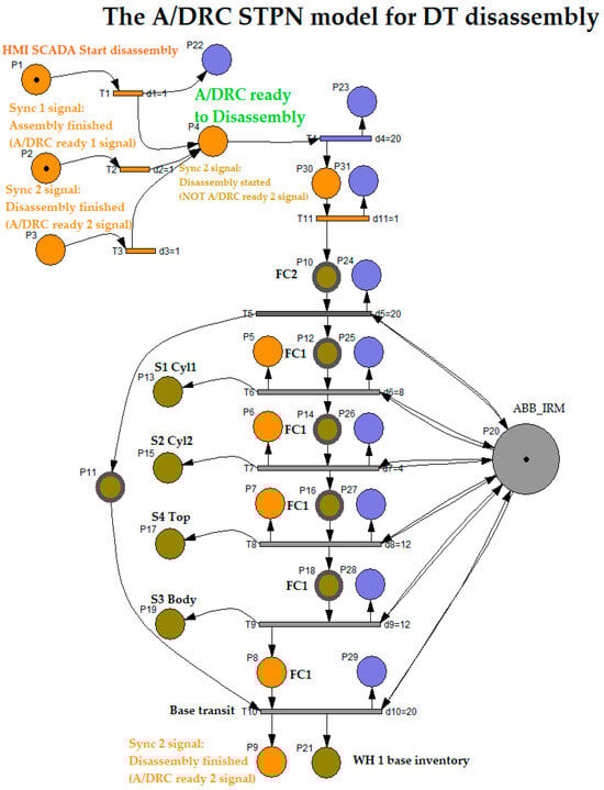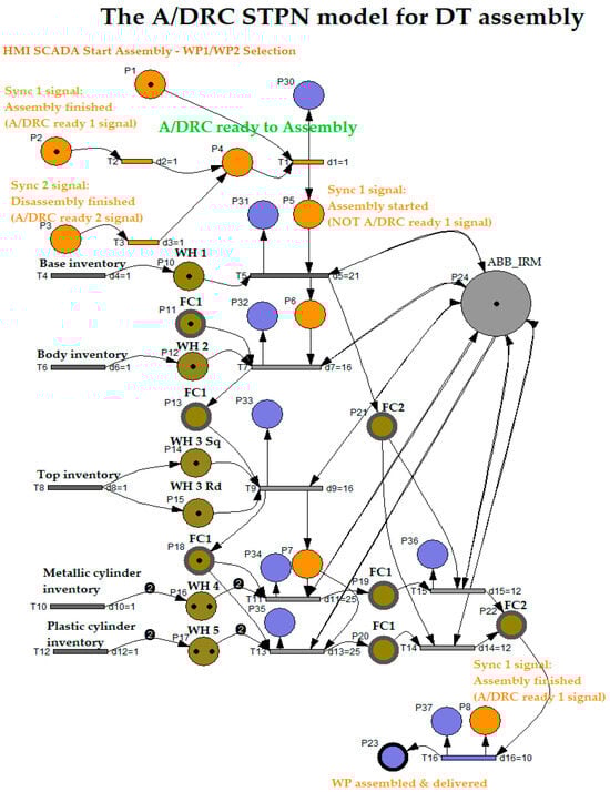 STPN model for A/DRC assembly operation starts by selecting one of the workpieces WP1 or WP2 to be integrated per component by the manufacturing process into the final product. The assembly process involves RM picking the subcomponents from the storage units, handling and assembling them on the Assembly Tray FC1, and transporting the assembled workpiece on the conveyor FC2 to the right-side exit line of the cell, all this with the corresponding time durations. Synchronizing signals for assembly processes are required, for time-align and monitoring checks issues of the PLC program. Therefore, a Ready signal from previous operations like assembly or disassembly is a condition for starting the current cell task. The STPN model, simulated in Sirphyco [] is shown in Figure 9.