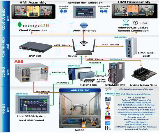 PROFINET interface enables HMI and SCADA to communicate with PLC, providing greater interoperability []. Therefore, several assembly tasks can be assigned to the A/DRC station, followed by the disassembly operation of the subcomponents using ABB 120 IRM. Process monitoring sensors are connected to the digital inputs of the PLC, components such as solenoid valves and actuators are connected to the PLC’s digital outputs while Jetson Nano using Node-RED [], helps integration of cell’s sensors to IoT application within DT and Cloud platform using OPC UA. Complex execution components, such as servomotor drivers, are also connected and controlled by the PLC via the PROFINET protocol. Thus, this system can be classified as an IoT system from Industry 4.0/5.0 perspectives. This type of communication enables quick and easy information data exchange between the robotic cell system devices, sensors, and the transport system, enabling communication technologies and applications over the Internet.