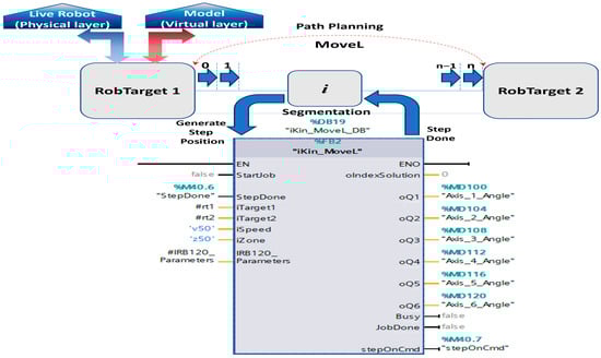 When calculating the corresponding axis positions (joint angles) through inverse kinematics, for the six-axis robot, there will be eight possible solutions generated [,,]. This means that the robot can reach the same end effector position and orientation, with several different link angles or configurations for the RM axes []. For reducing/selecting the desired joint angles solution out of the eight possible, the RM controller provides a subset of data through the robtarget data type; therefore, the robot configuration data type is specified using axis 1, 4, and 6 quadrant values. For a rotating axis, the configuration values define the quadrant of the robot axis meaning a 90° quarter revolution in a positive or negative direction. Component is used to select one of eight possible robot configurations numbered from 0 through 7. When the RM movement is finalized, the RM controller checks that the robot has reached the programmed configuration.
