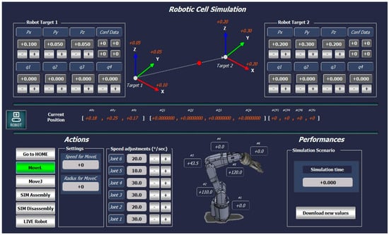 Remote and local SCADA systems serve as the operator control panel for interacting with the Twins, integrating key functions such as real-time monitoring, control, and visualization of A/D tasks, as well as managing data and controlling different scenarios or operations for the DT with the HIL platform. An intuitive and interactive operational interface is developed in SCADA, primarily used for testing the calculation of the six-DOF robot manipulator’s inverse kinematics. The remaining graphical displays are dedicated to DT interaction, providing a live representation of A/DRC runtime data. These displays provide also support for Cloud data collection, presentation, and analysis through Remote VPN, integrating IoT for dynamic remote access, analysis, or prediction. The SCADA environment used in this project as the DT Operator Panel is highly flexible and can be configured to suit a variety of industrial applications and manufacturing processes. Additionally, it supports a wide range of communication protocols such as PROFINET IO, OPC UA, and MQTT, enabling connections with various third-party hardware and software. While it is currently implemented for a single robotic cell with a six-DOF RM, it can be easily deployed, modified, and adapted for large-scale operations involving multiple robotic cells in a variety of industrial applications.