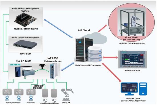 The rest of the paper is organized as follows: hardware structure, basic design concept, and architecture of the A/DRC assisted by ABB 120 IRM, IoT integrated within the DT application, and the Cloud environment, is presented in Section 2. The theoretical framework of 6-DOF RM kinematics is addressed in Section 3, highlighting the analytical methods for both the calculation and implementation of inverse kinematics. Robotic cell task operations and modeling using Petri Nets are also discussed. This section covers 3D virtual model implementation as well, using Siemens NX MCD software. Section 4 focuses on the design, implementation, and testing of a DT application including PLC program design. In this section, VC-“smart” manufacturing systems as new concepts of Industry 4.0/5.0 are introduced and the integration with DT for manufacturing systems is discussed. SCADA serves as a DT operator control interface for collecting, monitoring, and visualizing live data or Cloud history within the framework of the presented DT technology is described in Section 5. In this section, the integration of remote solutions via Cloud or VPN is also presented, exploring Node-RED application for building powerful, smart IoT integrated automation system. A/DRC testing and simulations for virtual model operations, as well as real-time control results for DT and Cloud solution implementation, are essential key points and will be discussed in Section 6. Section 7 is focused on discussing the outcomes, analyzing data, and reporting findings. The last section, Section 8, outlines the conclusions of the proposed approach.