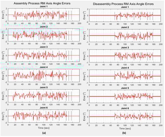 RM axis angles errors comparison for A/DRC process tasks according to STPN model transitions for physical system and DT virtual model: (a) A/DRC assembly operation; (b) A/DRC disassembly operation.