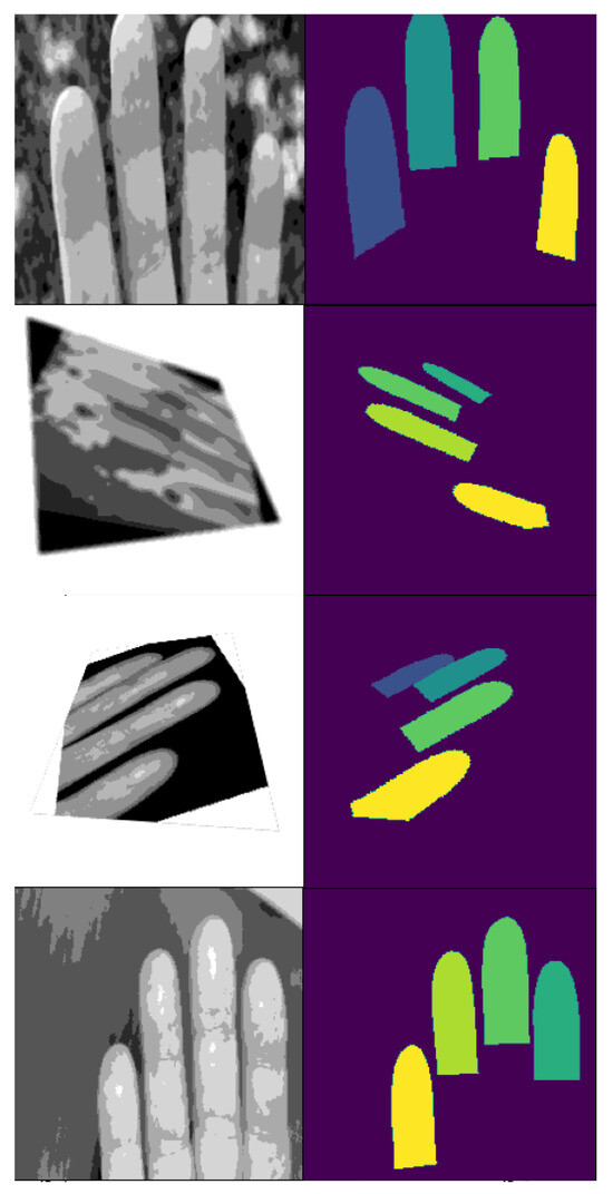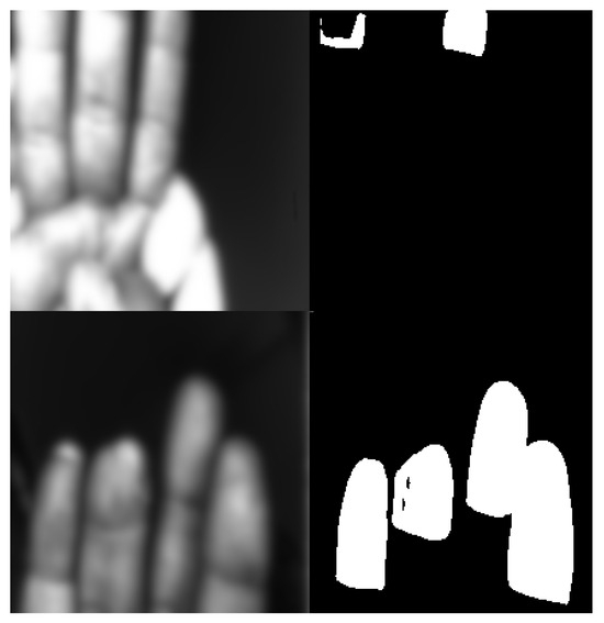 For contactless fingerprint sensors to be effective, accurate detection and segmentation of the fingertip from the recorded images are essential. This segmentation process is crucial for several downstream tasks, such as pose correction [5,6] and feature-based matching [7], which require an accurate mask of the fingertip region to separate the area from the background. The segmentation performance directly impacts the overall accuracy and reliability of the system. Traditionally, fingertip segmentation methods have focused mostly on segmenting a single fingertip against the background, and they have relied on various techniques, including color- or brightness-based [3,8], machine learning-based [9,10], and shape-based approaches [11]. Color-based methods utilize the distinctive skin tone of fingertips, machine learning-based methods leverage machine learning algorithms to identify fingertip regions, and shape-based methods focus on the geometric properties of the fingertip.
