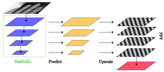 The FPN architecture enhances feature extraction by utilizing a top–down pathway and lateral connections. The model constructs a multi-scale feature hierarchy by progressively upsampling and merging high-level semantic features with lower-level features from earlier layers. This can be seen in Figure 2, where the four main layers of the ResNeXt architecture are symbolized using the blue color, and they depict the top–down pathway of the model. At each layer, the FPN creates a prediction, depicted with the yellow layers. Those predictions are made independently of each other. Those are then upscaled such that each of the output prediction layers matches the segmentation head dimensions, resulting in the checkerboard planes in Figure 2. Finally, the predictions are added together and fed into the segmentation head, which produces the model’s output.