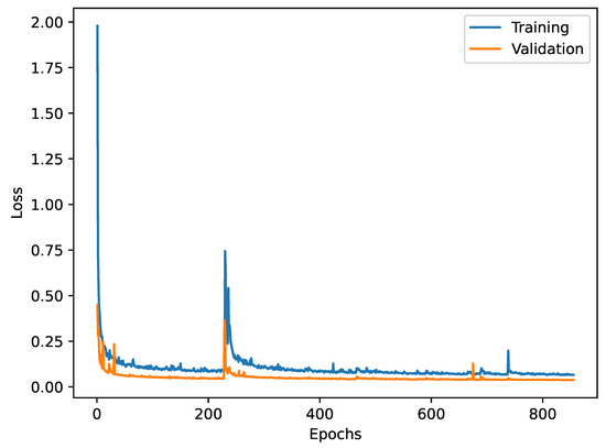 The model was trained for 853 epochs. During the training, we observed two major and a few minor spikes in both training and validation loss, as can be seen in Figure 3. However, the trend of both the training and the validation loss was downward. After around 10% of the run, the validation loss improved from 0.448 of the first epoch to 0.057. The final value after 853 epochs was 0.038. Although we did not observe signs of overfitting, we stopped the training run, because the outlook of further gains by continuing the training was diminishing.