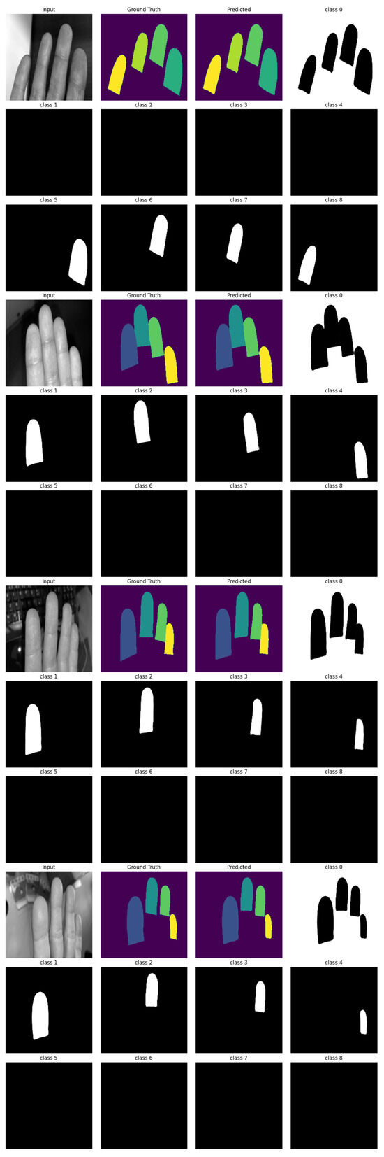 In Figure 4, we present four exemplary segmentation results. The model identifies nine classes, with Class 0 representing the background (the area surrounding the fingertips). Class 1 corresponds to the left index finger fingertip, Class 2 to the left middle finger fingertip, and so on, with Class 5 denoting the right index finger fingertip up to Class 8, which denotes the right little finger’s fingertip.