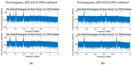 Periodograms for two subbands, [452 453.2] MHz and [852 453.2] MHz, at t1 and t2: The spectrum is evaluated for the real-valued measured signals r(t), ti ∈ [0 0.15] s, and, 360,000 samples. (a) Congested EMS: Periodograms for the 452 MHz subband with frequency hopping and sweeping communication. The RF signals have different modulation, characterized by the center frequency fci ranging from 452.02 to 453.18 MHz, and the signal bandwidth Bwi, Bwi varying as 500 ± 50 Hz, 750 ± 250 Hz, 5 ± 1 kHz, 7.2 ± 0.5 kHz and 11 ± 1 kHz. Two RF signals with different modulation and bandwidth interfere at ~452.395 MHz; (b) Periodograms for the [852 853.2] MHz subband with the RF signals with corresponding center frequency fci, and 10 ± 1 kHz bandwidth Bwi.