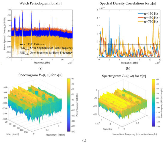 (a) Welch periodogram for x[n]; (b) Computed spectral density correlation for different cyclic frequencies; (c) Spectrogram: spectrum evaluation in the temporal and spectral domains.