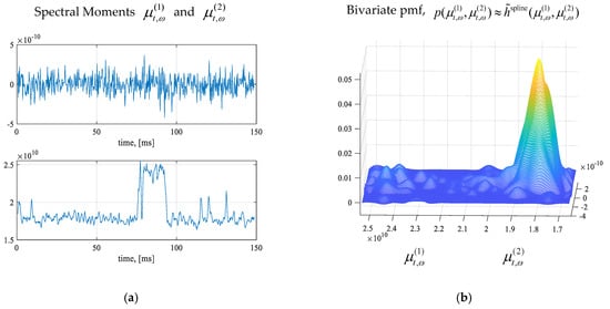 In a narrowband, one may map nonstationary processes as stationary by using the method of differencing. The difference–stationary stochastic processes are used, achieving an acceptable degree of stationarity. Characterize the RF signals in the multi-band spectrum using the naïve Bayes models and Jaccard index. In the studied narrowband, using the threshold on the signal power, six high-power signals were used, which are documented in Figure 1a and Table 2. We studied the observed bandwidth-clustered RF signals with varying power, gradients, frequency, covariance and correlation. That is, identify and apply descriptive and informative features and indicators to explicitly characterize signals within the spectrum. We used the signal bandwidth Bw, PSD Sxx(ω), gradient of power variations , and probability characteristics. With a focus on high-fidelity analysis, one considers the transceiver modalities, temporal modes, etc. The signal corner frequency fc may not be considered as an attribute due to frequency hopping and sweeping. To characterize instantaneous variations in spectra, the spectral moments are used. Using (5), the computed spectral moments are documented in Figure 3a. The bivariate pmf for and distributions are found by spline interpolating the normalized bivariate histograms. Figure 3b reports the computed descriptive pmf which yields the distribution under the applied hypotheses.