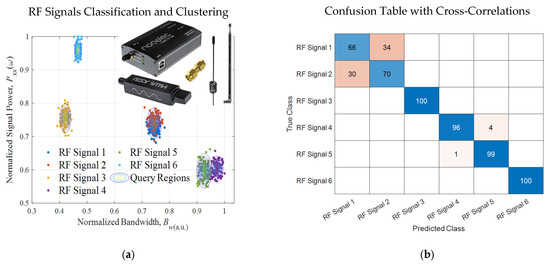 Using the reported algorithm, six signals were detected, identified and characterized. Adequate classification probability was achieved. Figure 4a depicts the query regions. For different measurements at (t1, t2, …, ∆t), the classification accuracy for six signals varies between 62% and 95% due time-varying . The RF signals 1 and 2 exhibit similar attributes and features and are likely identical to the two-channel redundant communication by the same transmitter. Cross-validation of the models was performed. The signals were then tabulated and classified, as reported in Figure 4 and Figure 5. Figure 4a illustrates the RTL-SDR dongle, connected to the laptop/desktop or SoC/FPGA using a USB port and WinUSB/Zadig driver. The frequency range is from 500 kHz to 1750 MHz. Using the L1-norm to define the loss function , the maximum cross-validation loss is 0.205. We achieved an adequate accuracy in detection, characterization, classification and clustering. The confusion table is documented in Figure 4b. The Büchi automata scheme yields consistent accuracy with latency less than 0.053 s. The computed posteriors probabilities, shown in Figure 5a, yield an accuracy in classification from 62% to 95% for signals 1 and 2, and, 94 to 100% for other RF signals, as documented in Figure 5b. For the considered case studies in the studied commercial RF bands, the results [22,23] yield high misclassification, except for signals 1 and 2. The feedforward fully connected neural network was evaluated. Learning algorithms, models and scalable machine reasoning schemes were studied and substantiated.