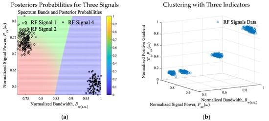 (a) Posteriors probabilities for three RF signals; (b) Classification and clustering using .
