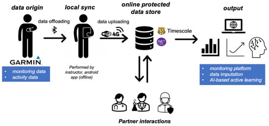 The data on the server were stored in a Postgres SQL (v17.0) database with TimescaleDB (v2.17.0) [25] extensions to allow for efficient date time and timestamp operations. The data were pushed from the smartphones to the server through an Application Programming Interface (API) built with ASP.NET Core (v9.0). This API was also used to manage partner interactions built on top of the collected data. These are outside the scope of this publication, but some examples are as follows: monitoring of the metabolic energy balance [26], analyses of structured running workouts [27] during PE sessions, body scans [28], and the integration of sweat-lactate measurements [29] for selected exercises. Authorized partners can query the information relevant to them and also add their own results in the centralized database. The data on the server were roughly subdivided into five categories: monitoring data, activity data, sleep data, injury reports, and wellness questionnaire data. Monitoring data, activity data, and sleep data are pushed from the watches to the database through the Android application. The other data (i.e., wellness questionnaires and injury reports) can be inserted via a web-based front-end application by the medical examiner (for injury reports) or by the recruits or study personnel for wellness questionnaires (when they are filled out on paper while in a connectionless environment). This workflow allows for the further integration of other measurement tools and information with minimal modification to the base code (e.g., inclusion of blood sample results, clinical refractometer, or nutrition data).