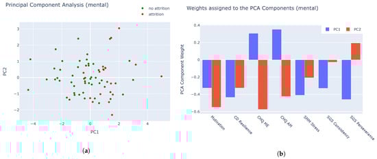 (a) PCA based on the answers of the baseline questionnaires (first 2 components). We notice that most of the recruits that underwent attrition are on the right side of the scatter plot. (b) Weights of the PCA analysis on the results of the mental baseline questionnaires from Table 3.