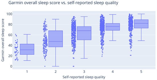 The distribution of each measured sleep score in the function of the reported score is shown in Figure 6. The Spearman correlation coefficient between both values is 0.51. Since this is only a moderate correlation, it is inappropriate to use the reported sleep score as a drop-in replacement for the self-reported sleep score. The (sometimes large) difference could be attributed to the inability to cope with the harsh military environment, which is significantly different compared to the living circumstances of the general population. Some of the error could also be explained by the measurement accuracy of the device. The validity of the hardware itself is not further discussed in this publication, but studies of consumer-focused wearables are still regularly performed [16,17].