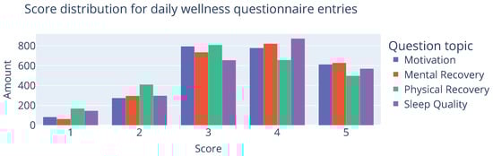 During the second testing phase, recruits filled in the daily wellness questionnaire (DWQ) every morning during breakfast. It consisted of questions for each of the following categories, which were scored between 1 and 5: sleep quality, motivation, mental recovery, muscle soreness, energy intake, and physical recovery. The total amount of DWQ entries in this test phase was 2543. In the remainder of this section, we focus on developing a predictive scoring technique, focusing mainly on the design for sleep scores with a technique that is transferable to other parts of the questionnaire as well.