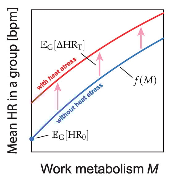 where M and H represent the work metabolism and heat stress level, respectively; represents the operation taking the mean in a collective dataset of workers; and the function describes the heart rate depending on the work metabolism M without any heat stress.