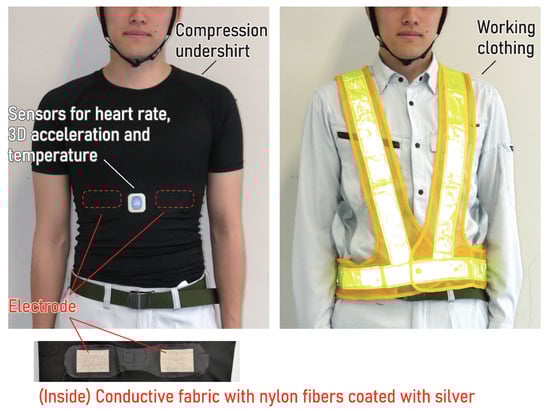 In this study, we reanalyzed the data collected during two summer periods from July to September 2018 and 2019. These data were stored in a cyber–physical system designed to integrate and analyze measurements from undershirt-type heart rate monitors (Figure 2), marketed under the name Smartfit for Work (www.smartfit.jp (accessed on 7 January 2025)). Smartfit for Work is a heat stress monitoring system for manual labor sites, developed by Kurabo, and is provided as a service to companies for real-time assessment of heat stress risks. In a clinical study on occupational diseases supported by the Japanese Ministry of Health, Labor, and Welfare, the system’s validity was verified, and it was evaluated as an effective tool for risk assessment in high-temperature working environments [38].