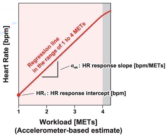 To characterize the heart rate responses of the workers, we defined two indices: the heart rate response intercept and the heart rate response slope . These indices were derived by fitting a linear regression model to the relationship between heart rate and estimated workload determined by the accelerometer.