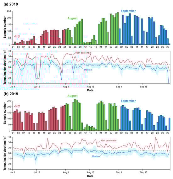 Daily sample numbers (upper panel) and temperatures inside the clothing (lower panel) for 2018 (a) and 2019 (b). The dataset for these two years comprises observations totaling 21,166 days. The temperature inside the clothing was calculated by identifying the maximum daily temperature for each worker. The median (solid blue line), interquartile range (shaded light blue area), and 95th percentile (solid red line) of these daily maximum temperatures were then calculated across all workers. The dashed lines in each lower panel of (a,b) indicate 35 °C.
