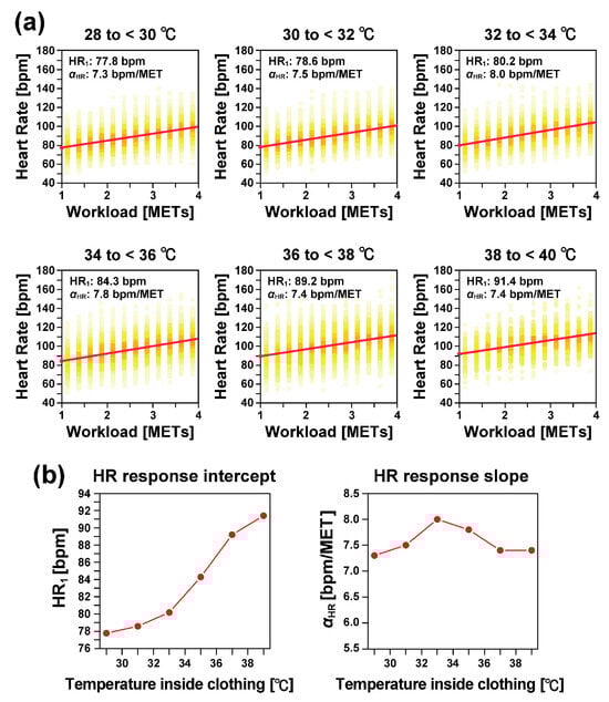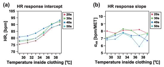 As illustrated in Figure 5b, the heart rate response intercept () increased monotonically as the temperature inside the clothing increased. Specifically, increased by 13.6 bpm when the temperature increased by 10 °C, from 29 °C to 39 °C.