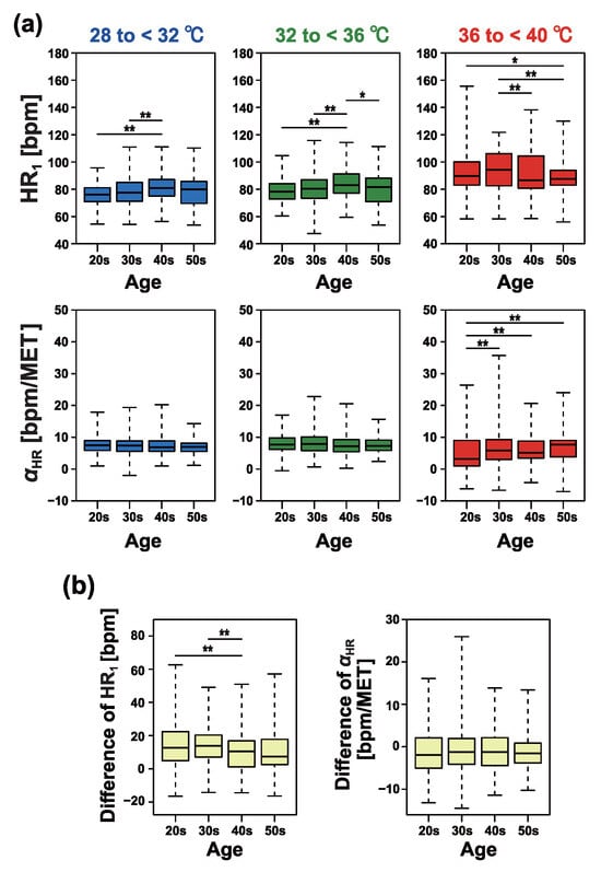 As shown in Figure 7b, we further analyzed the differences in the indices and caused by increases in clothing temperature. Specifically, we calculated the differences in each index between two temperature conditions: 28 to <32 °C and 36 to <40 °C. The relative changes in both indices did not indicate a need to consider age-related differences among workers aged 20 to 59 years.