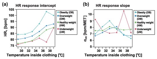 (a) Dependence of heart rate (HR) response intercept on temperature inside clothing in each BMI category. (b) Dependence of heart rate (HR) response slope on temperature inside clothing in each BMI category. See Table 1 and Table 2 for the BMI category definitions and number of workers in each BMI category.