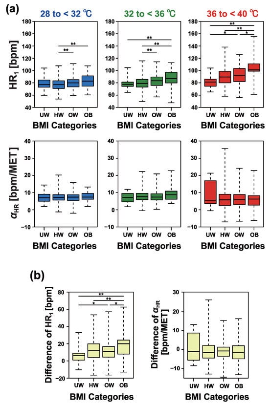 Figure 9 provides detailed comparisons of individual differences between BMI categories. As shown in Figure 9a, under conditions of 32 to <36 °C and 36 to <40 °C, exhibited a monotonic increase with increasing BMI categories. In contrast, showed no significant dependence on BMI.