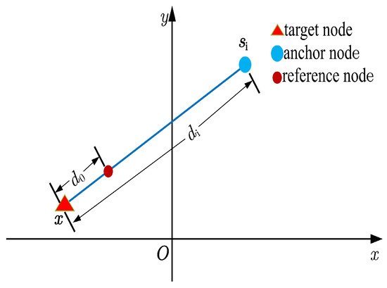 Consider a WSN consisting of N anchor nodes and a target node. The anchor nodes are randomly deployed at known locations (), while the target node’s location is unknown. A designated reference node is positioned at a known reference distance from the target node. It provides the reference path loss (in dB) at , which serves as a baseline for signal strength normalization. Using this reference, the i-th anchor node can determine the path loss between itself and the target node, as illustrated in Figure 1. The corresponding measurement model is expressed as follows: