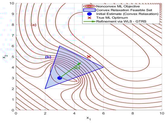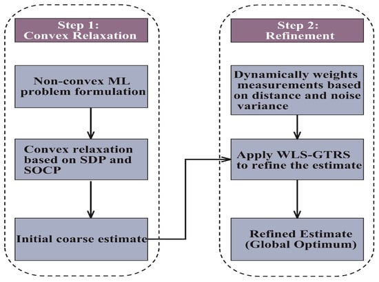 Step 1 (Convex Relaxation): The nonconvex ML problem is transformed into a convex problem by applying SDP and SOCP relaxation. This step generates an initial coarse estimate of the target location.