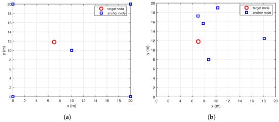 Two networks with different anchor nodes deployments. The target node and anchor nodes are represented by circles and squares, respectively. (a) The first network with a regular deployment. (b) The second network with an irregular deployment.