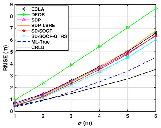 Figure 5 shows the RMSE performance of different localization methods under different shadowing standard deviations (). As increases from low to high values, the RMSE of all methods increases due to reduced RSS measurement reliability from higher noise levels. Specifically, the RMSE of the DEOR method shows a significant increase at higher values, while the proposed SD/SOCP-GTRS method achieves a notable reduction in error compared to others. Although the intermediate estimate of the first step (SD/SOCP) remains stable with a certain level of RMSE, it is slightly less accurate than the SDP-LSRE method. However, after the second step (GTRS refinement), the RMSE of SD/SOCP-GTRS further decreases, outperforming others and staying close to the theoretical bounds across all values. This indicates that the proposed method can maintain robustness through two-step optimization even under strong noise interference, with performance approaching the theoretical optimum.