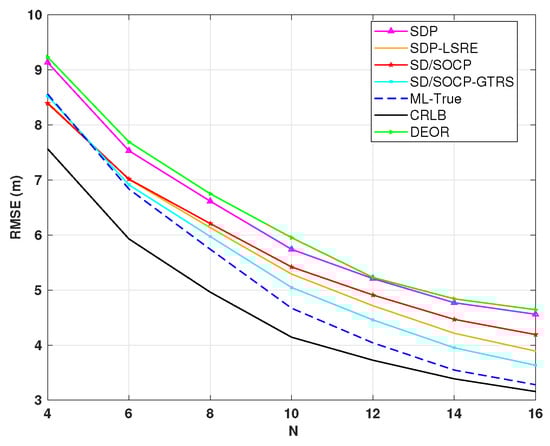 RMSE versus the number of anchor nodes N for dB, , dB, m, and .