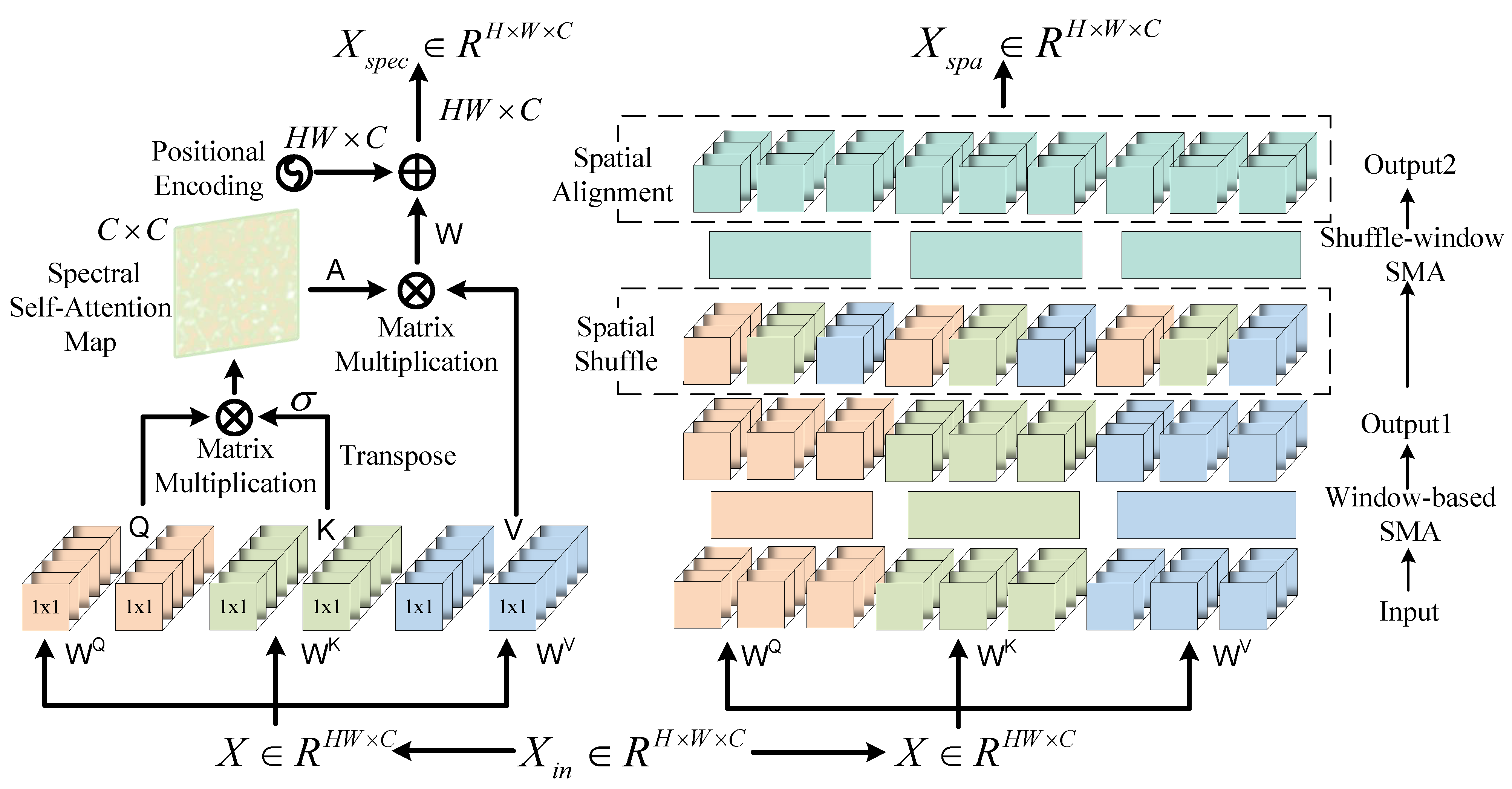 - To optimize hyperspectral reconstruction, we propose a Spatial-Spectral Attention Block (SSAB) within the reconstruction backbone of ARM-Net. The SSAB jointly models spatial and spectral dependencies to enhance reconstruction accuracy, which compensates for spatial detail loss during compression. Spectral-Wise Multi-Head Self-Attention (Spec-MSA) and Spatial Multi-Head Self-Attention (Spa-MSA) in the SSAB are linked by residuals to effectively compensate for the lack of spatial details in HSI reconstruction through spectral reconstruction (SR) networks. This versatile and efficient plug-and-play spatial-spectral attention mechanism captures fine-grained features across both spatial and spectral dimensions while preserving a linear relationship between spatial dimensions and computational complexity.