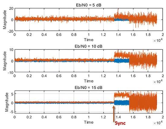 The zero crossing detection (ZCD) algorithm was applied to restore symbol timing. Figure 2 illustrates the accuracy of synchronization detection using the ZCD algorithm. The transmission signal magnitude, consisting of noise and the preamble, is represented in blue, while the output signal magnitude from the ZCD algorithm is shown in red. As the energy-per-bit to noise power spectral density ratio increases from 5 dB to 15 dB, the accuracy of synchronization detection improves, enabling clear and precise synchronization detection [28,29]. By employing the ZCD algorithm, the reliability of synchronization detection is significantly enhanced, allowing more accurate signal detection even in challenging noisy environments.