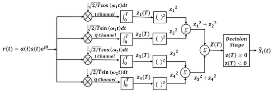 where is the received symbol coefficient representing the modulated signal amplitude and is the phase. This approach enables demodulation without relying on the phase information of the received signal, providing a simple yet efficient demodulation process. The non-coherent detection method ensures reliable demodulation performance across various environments, enhancing system robustness and versatility [20,27]. The values and are integrals used to extract the signal component at frequency , while and serve a similar purpose for frequency . The combined detection metric is calculated as shown (5).